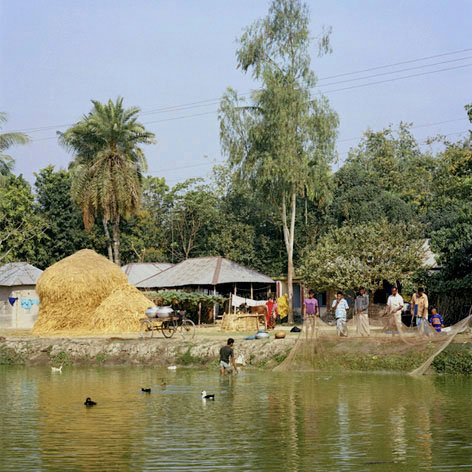 | Small scale farmers in the countryside often live in traditional houses made from clay. In earlier times they where covered with rice straw, now often corrugated iron is used since it is cheaper than the organic material. Clusters of cow food, animals like cows, goats and poultry, a pond for fresh fish as well as a stand for bean plantation form part of every household. |